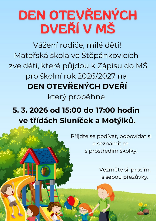 Vážení rodiče, milé děti! MŠ ve Štěpánkovicích zve děti, které půjdou k Zápisu do MŠ pro školní rok 2026/2027 na „DEN OTEVŘENÝCH DVEŘÍ”, který proběhne 5. 3. 2026 od 15:00 hod. – 17:00 hod. ve třídách Sluníček a Motýlků. Přijďte se podívat, popovídat si a seznámit se s prostředím školky.